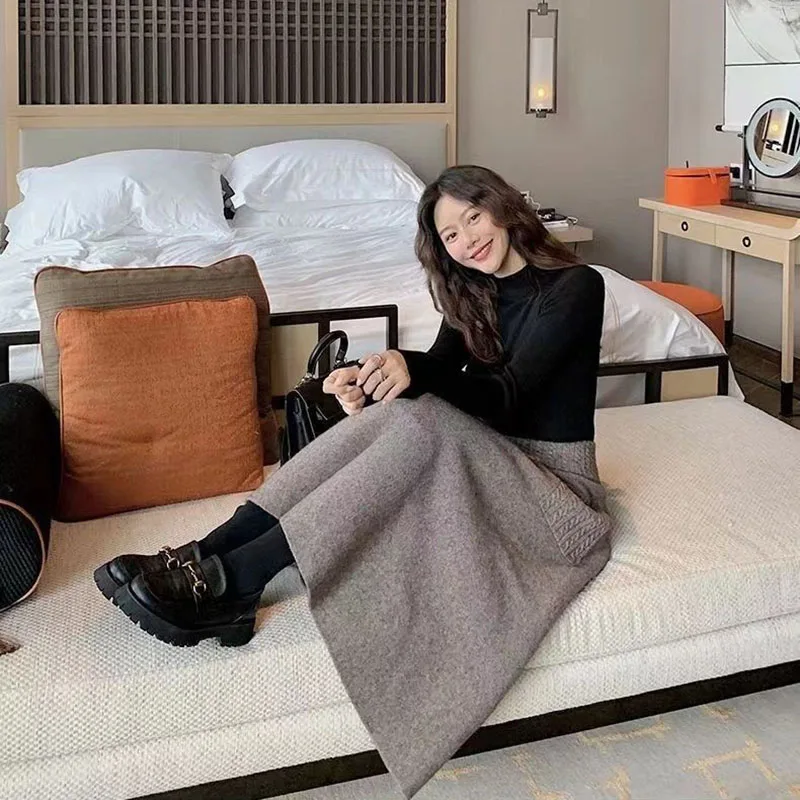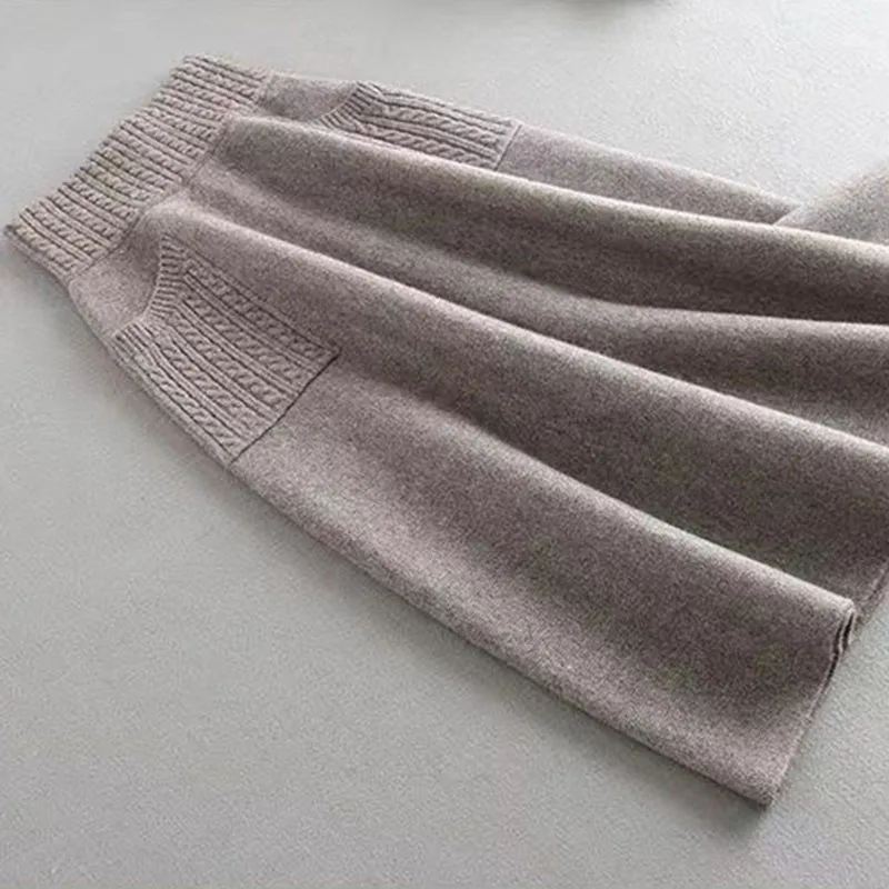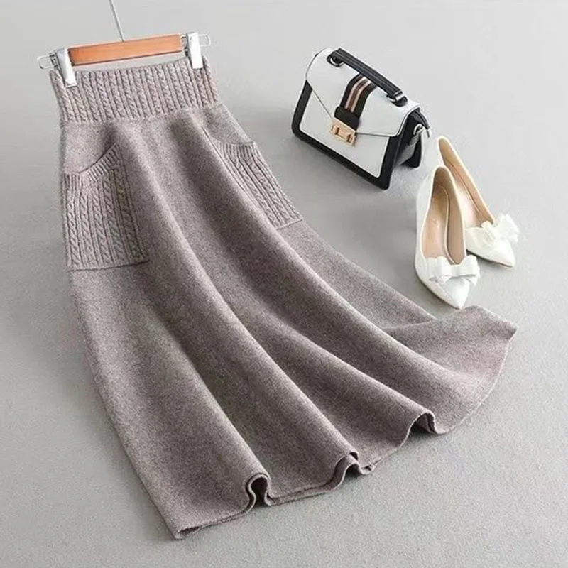Women Knitted Midi Skirts Two Pocket Long Skirt Female Elegant High Waist Skirts